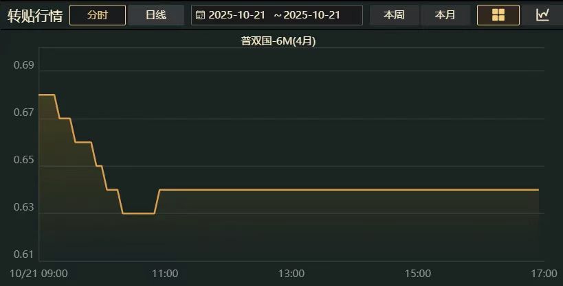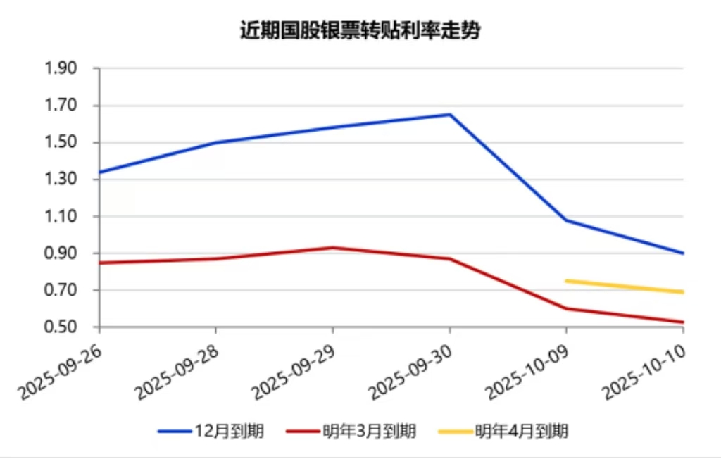 2025 年 10 月首个交易日,票据利率按预期大幅低开。2026 年 3 月到期国股银票利率下降 26 个基点至 0.60%,4 月到期品种开盘报 0.80%,当日内便降至 0.75%。
